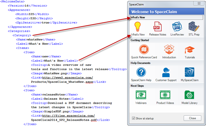 When the Welcome screen launches, it looks first for the Welcome.xml file and uses that file to set the layout and behavior of the buttons. It looks first in the %APPDATA%\SpaceClaim \Welcome directory (typically C:\Documents and Settings\user\Application Data\SpaceClaim \Welcome\) and then in SpaceClaim InstallDirectory\Library