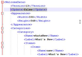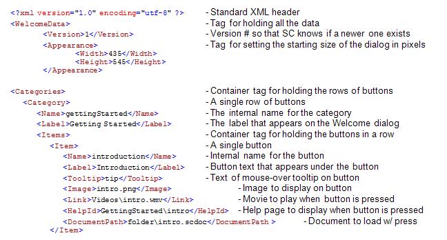 The following tags are used in Welcome.xml to specify the content and behavior of the Welcome screen: