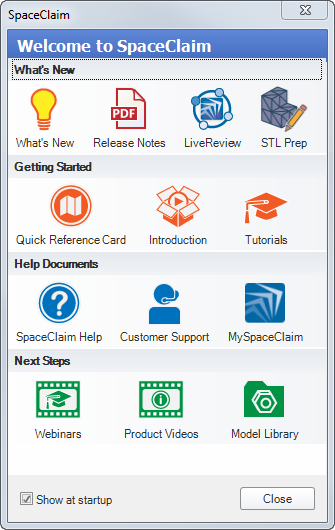 You can hide the Welcome window by unchecking the Show at startup checkbox. To redisplay the Welcome window, check the Show welcome screen box on the SpaceClaim Popular options page.