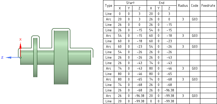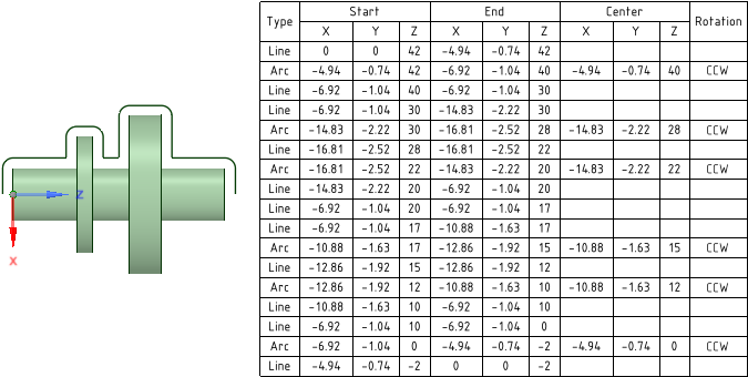 Manufacturing-focused tables are created for Turn Profile curves. They contain information that is useful for programming the turning machine.