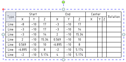A Snapshot table breaks a 3D curve or curves into straight line segments and reports the endpoints of the segments. An example is shown below.