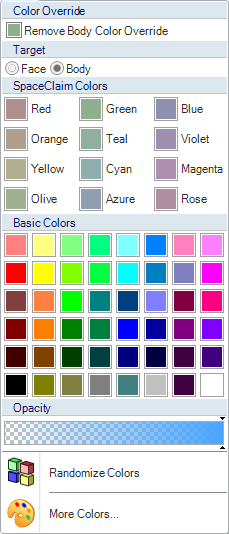 [表示] タブの [スタイル] リボングループにある [色] ツールを使用すると、ソリッド、サーフェス、面、カーブのレイヤの色または 3D マークアップスライドの個々の面の色を上書きできます。カラーパレットにカスタムカラーを追加すると、その色がメニューの最下部に追加され、SpaceClaim セッションの間は変更しません。