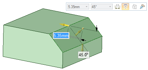 を調節したり、オフセットを変更したりすることができます。面取り寸法を変更するには、面取りの上または下の矢印をドラッグします。面取りのオフセットを変更するには、面取りに垂直な矢印をドラッグします。エッジを旋回することもできます。旋回すると、面取りの寸法プロパティが新しい値に変更されます。