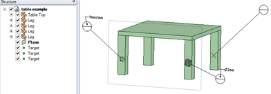 たとえば、4 本足のテーブルでは、各足は同じコンポーネントですが、テーブルアセンブリ内の各足は、別々のデータムターゲットを必要とする場合とターゲットをまったく必要としない場合があります。以下の画像を参照してください。