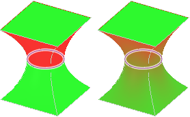 この例のシャドウラインは、曲面の角度と勾配角度が同じ場所を示します。左の例は、[色の遷移] オプションが低く設定された場合を示し、右の例は、[色の遷移] オプションが高く設定された場合を示します。