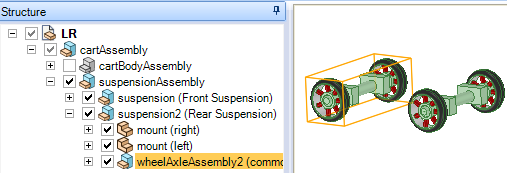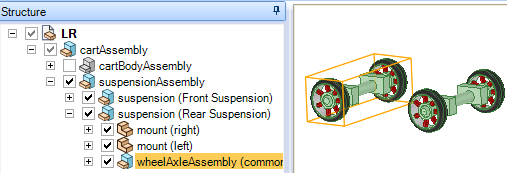 も独立コンポーネントになります。サブアセンブリがコピーされたデザインのストラクチャーを以下に示します。wheelAxleAssembly サブアセンブリのコピー (ハイライト部分) が両方のサスペンションアセンブリに存在します。