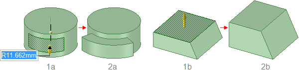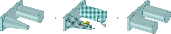 円錐面を平行円筒面までプルすると、両方の軸が近接している場合、円錐が円筒に置き換わる。近接していなければ、円錐面が円錐と同軸の円筒面に置き換わり、半径は円筒と同じになる。