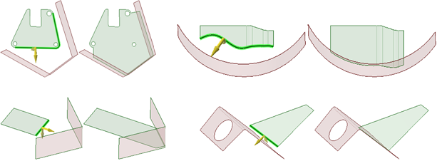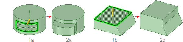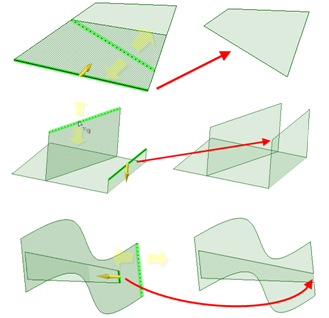 [最後まで] オプションを用いたエッジのプル。上図の緑のサーフェスにある下側のエッジを選択すると、隣接サーフェスが選択したエッジの終点を越えて延長していないためエラーが表示される。隣接面がその長さを超えて延長しているため、面の右側のエッジはこのオプションによってプルできる。新しいエッジが作成される (右の図の赤で示された部分)。