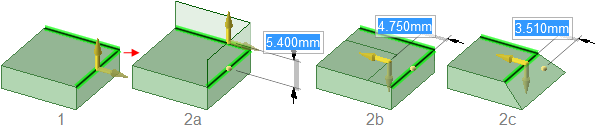 [エッジの延長] (2a)、[エッジのコピー] (2b)、[ピボット] (2c) オプションを用いた 2 つのエッジのプル