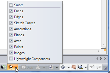 下のイメージのように、ステータスバーの [選択フィルタ] コントロールを使用すると、選択をフィルタできます。[スマート] オプションにより、デザイン領域でボックス、なげなわ、ペイント選択モードを使用するときのオブジェクトの選択方法を指定します。