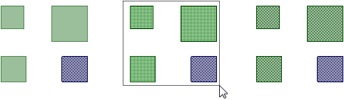 ボックス選択で選択を切り替える場合は、Ctrl キーを押したままにします。最初のイメージでは、青いボックスが選択されています。Ctrl キーを押したままにしてボックス選択を行うと、青いボックスの選択が解除され、緑のボックスが選択されます。