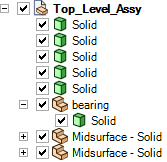 [デザイン] ウィンドウで Top_Level_Assy オブジェクトを全て非表示にし、再度表示するために、[Top_Level_Assy] の横にあるボックスを 2 回クリックします。