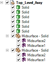 [共有トポロジー] プロパティに True が設定されている場合、同一コンポーネント下にある複数のソリッドは、一つのマルチボディパーツとして ANSYS に送信されます。このケースでは、ソリッドはトップレベルにあり、二 つの中立面もそれぞれ固有のコンポーネントに存在します。ANSYS 13.0 から ANSYS 15.0 へ送信されたデザイン構造を介して、どのように共有トポロジーが伝播するかについての詳細情報は、ANSYS の共有トポロジー を参照してください。