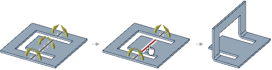 また、サーフェスに沿って複数のベンドラインを配置することもできます。シートメタル面に沿って新しいベンドラインを配置するとき、まだ曲げられて (フリップされて) いない既存の進行中ベンドは選択解除されたままです。