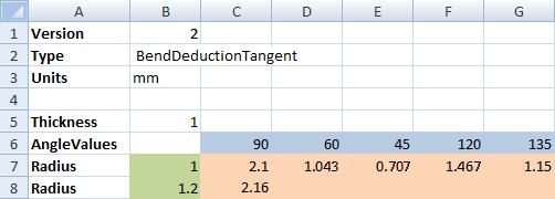 最初のパラメータ (Radius) は、テーブル行にベンド内径を表示します。2 つ目以降のパラメータは全て、角度と半径の各組合せ |