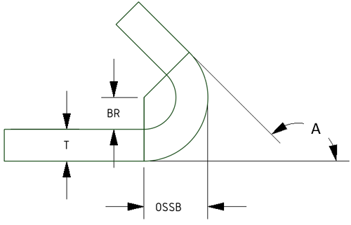 90 度未満のベンド角度の場合、OSSB はベンド始点から外側金型ラインまでを測定