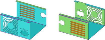 シートメタルに作成された壁、ベンド、接合 (作成されたディフォルトサイズの接合のみであり、インポートされた接合ではない)、およびフォームは色で識別されます。つまり、面は青、接合は紫、フォームはオレンジ、部分ベンドは黄色、正方形ではない終了面のエッジは赤です。パーツを展開するとき、要素をまっすぐに平面