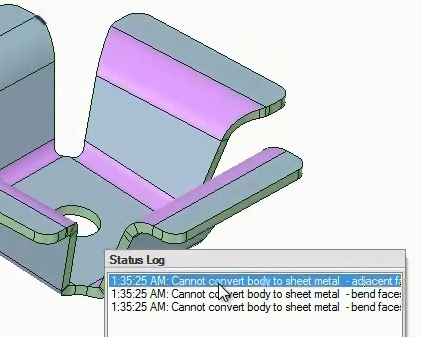 シートメタルを変換すると、問題がある面が特定され、[ステータスログ] にメッセージが表示されます。それぞれのメッセージをクリックすると、問題は赤い点滅でハイライト表示になります。以下の例では、メッセージが選択され、左端の図の左上角に問題がハイライト表示されています。右端の図の下は、問題ジオメトリの詳細ビューです。