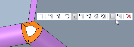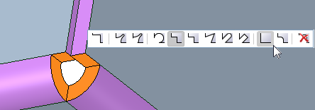 [コーナーリリーフ] オプションツールで指定します。ディフォルトタイプは正方形ですが、別のタイプに変更可能です。[コーナーリリーフ] オプションツールのアイコンは、コーナーリリーフタイプに合わせて変更されます。この設定は、SpaceClaim を閉じるまで保存されます。