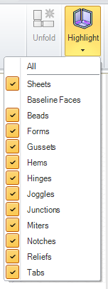 下図に示すように、[シートメタル] タブの [表示] グループにある [ハイライト] ドロップダウンから [全て]、またはその他のオプションを選択します。