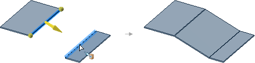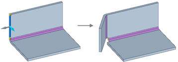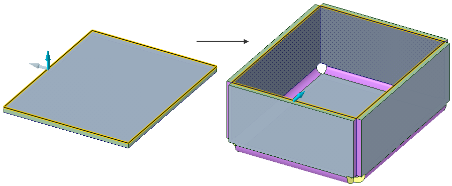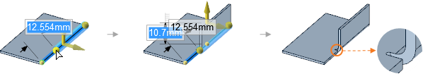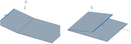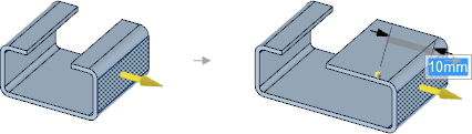 エッジ位置による(自動): シートメタルのエッジにプルを実行する際、ベンド半径の位置は選択するエッジとプルの実行方向によって決まります。