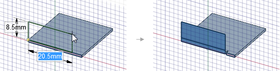 既存のウォールに対する垂直線をスケッチすると、必要なコーナーやリップリリーフ付きのウォールの間にベンドが付いた新しいウォールが作成されます。ベンド半径は、スケッチが上部エッジに接続されるときは内側に、スケッチが下部エッジに接続されるときは外側に作成されます。