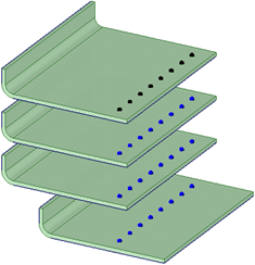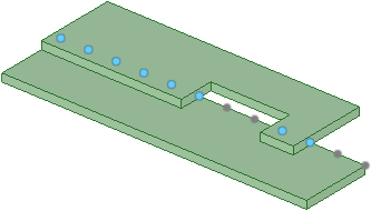 スポット溶接点が別のボディで検出されると、下の画像のように、セットには同一ボディ内に合致が存在する点は含まれません。セット内の溶接点のうち、合致が存在する点は青色、合致が存在しない点は灰色で表示されます。