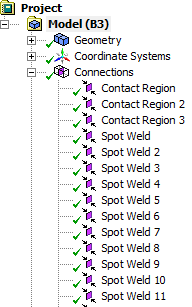ANSYS でストラクチャーツリーを展開すると、次のように [接続] ノードの下にスポット溶接が表示されます。