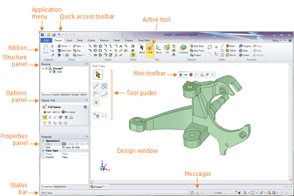 この図は、SpaceClaim アプリケーションの主要なインターフェース要素を示しています。