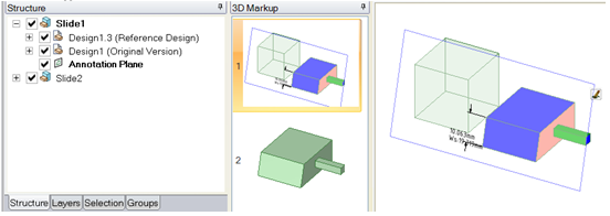 [ストラクチャー] ツリーは、各スライドの内容を表示します。3D マークアップスライドは、スライドショーで二つのスライドを表示します。[デザイン] ウィンドウには、変更面の寸法と色で比較される、基準(参照)バージヨンと元のバージョンが表示されます。