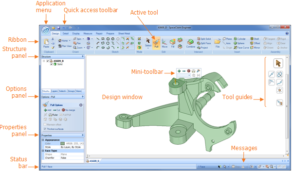 This image shows the major interface elements in the DesignSpark Mechanical application: